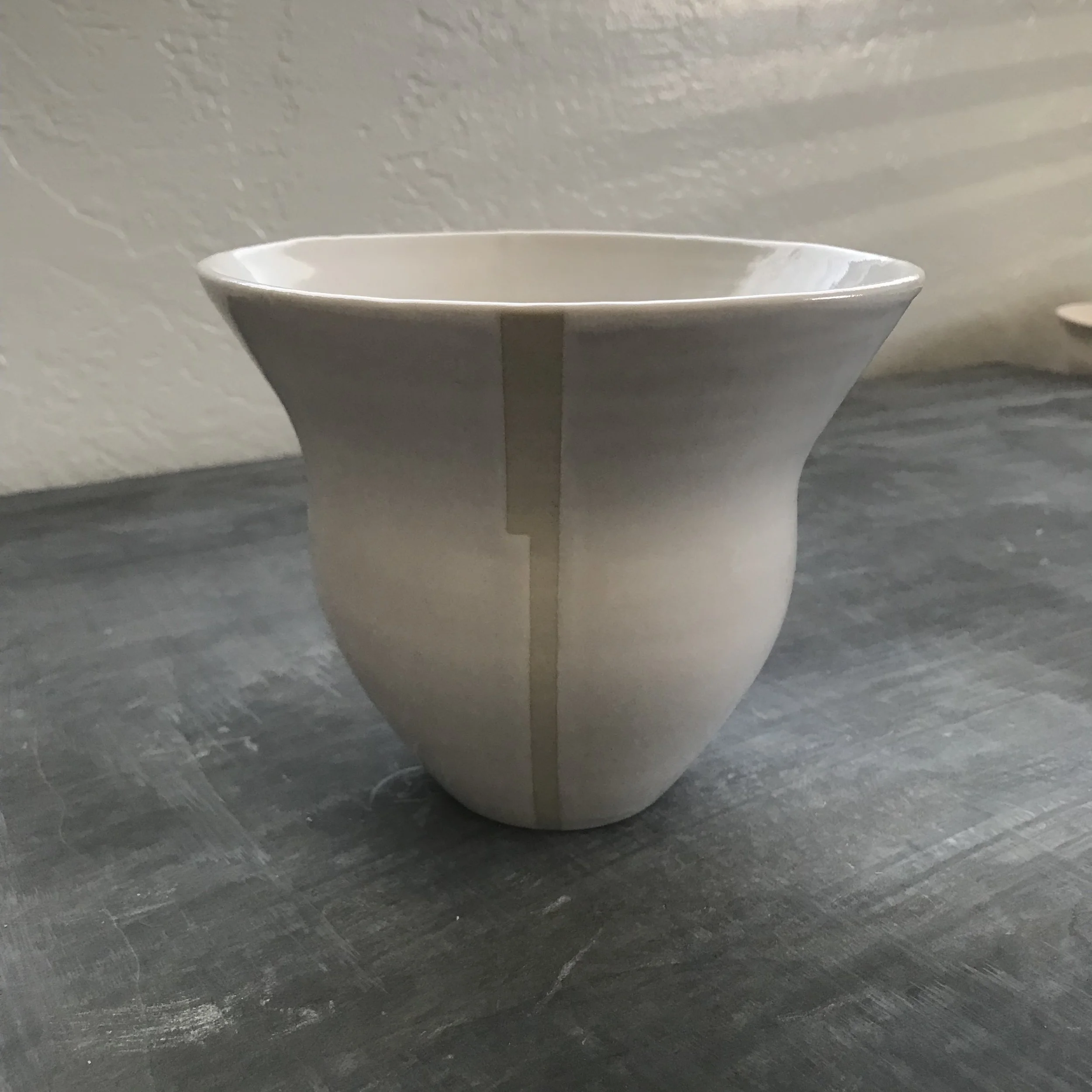 Words cannot fully describe the feeling I had as I was throwing this piece on the wheel. It felt other-worldly, as if a quiet helper were throwing through me, as if we and the clay were one in a single, focused breath. It remains one of my favorite pieces to date—the subtle lines woven into the form itself are gently accentuated by the linear exposure of the naked porcelain, revealing both restraint and presence. This piece now serves as the quiet inspiration for a new collection, Of the Present.